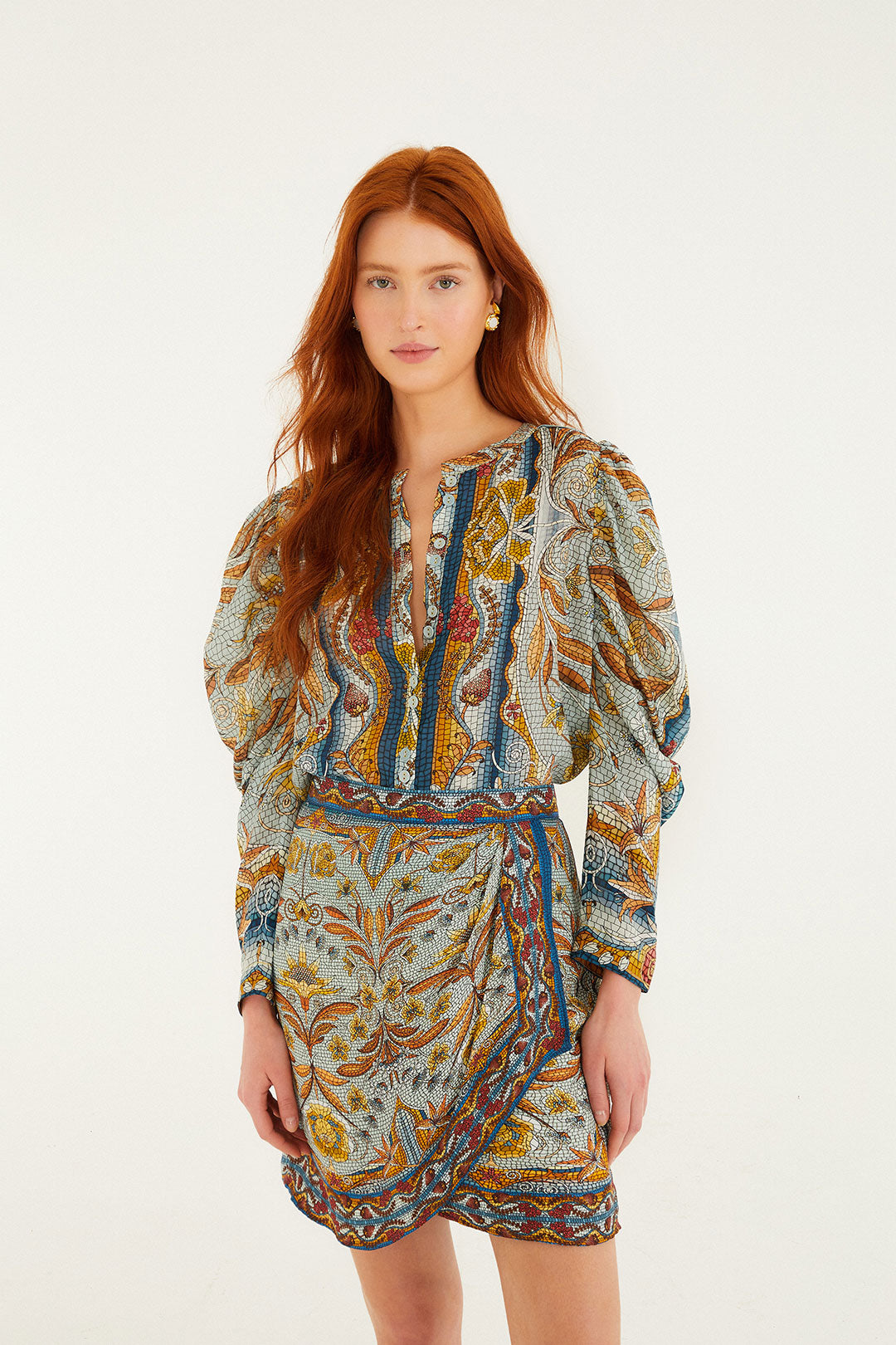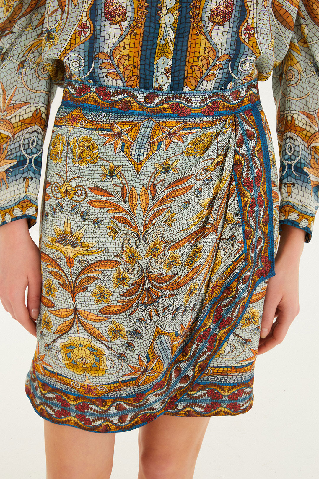 The Mosaic Garden Mini Skirt from Farm Rio features a delicate mosaic garden pattern in cool hues. The playful wrap-style silhouette and intricate pattern create a vibrant tapestry of colors, making it an effortless choice for many occasions. Its harmonious blend of traditional artistry and modern design ensures you feel chic and full of life. Pair with the Mosaic Garden Long Sleeve Blouse for a matching look.