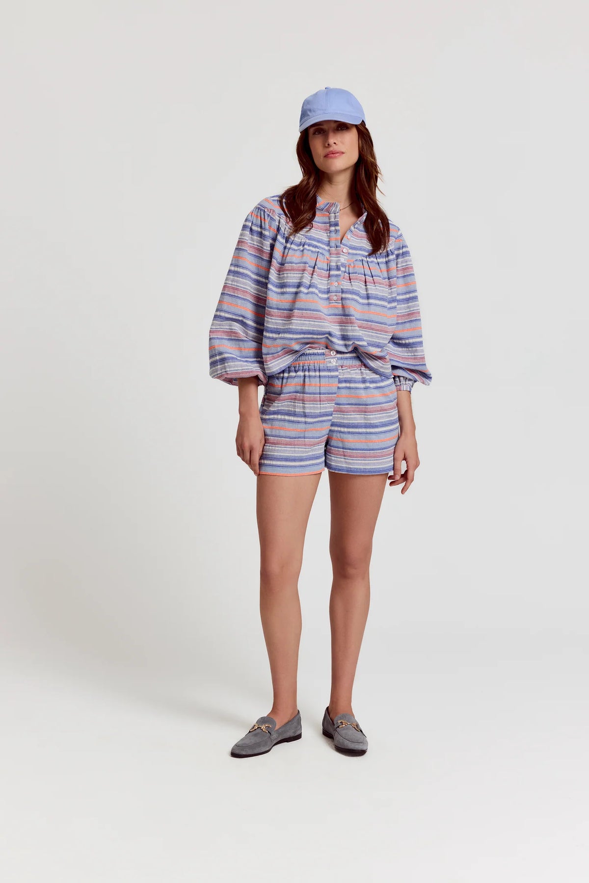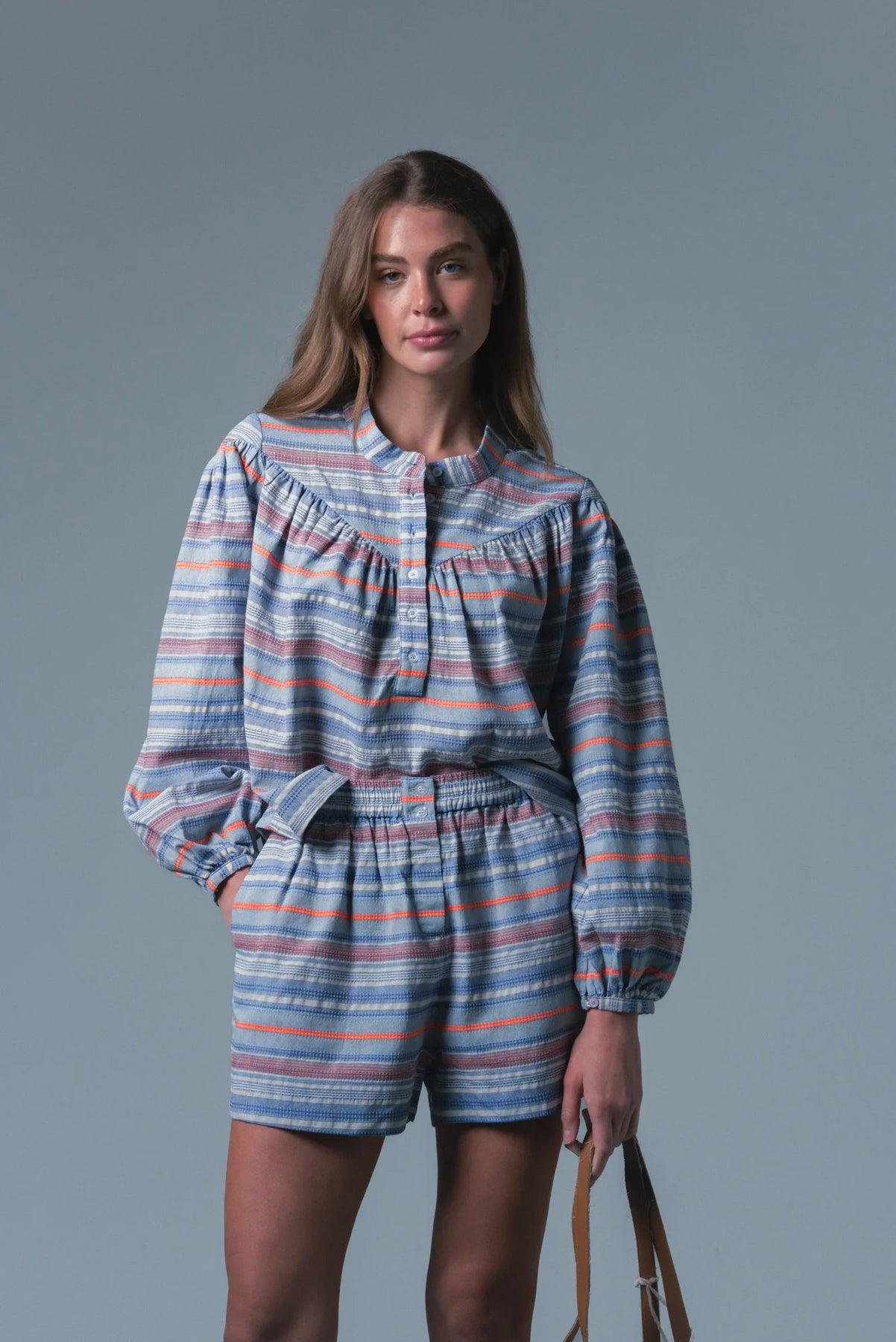 Matches back perfectly with The Logan Shirt. Create a set for the perfect polished outfit in Rochelle Behrens Blue/Orange Stripe.