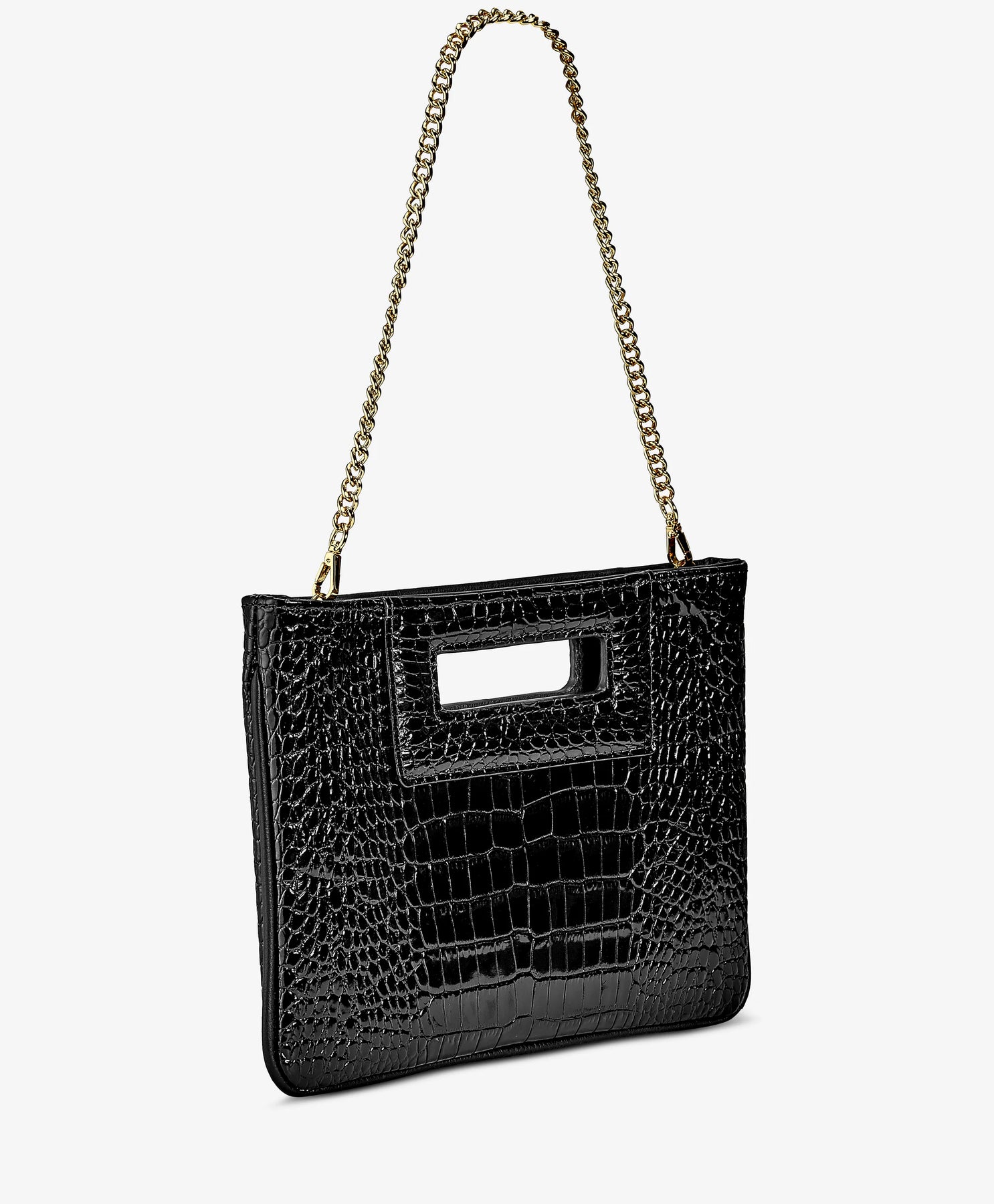 Elevate any night out or special occasion with this versatile piece that can be worn comfortably on the shoulder or as a clutch. The Willa Clutch is handcrafted in black embossed croc leather. There is a cutout handle detail and a detachable gold chain strap. Lined with canvas and finished with a hidden magnetic closure.
