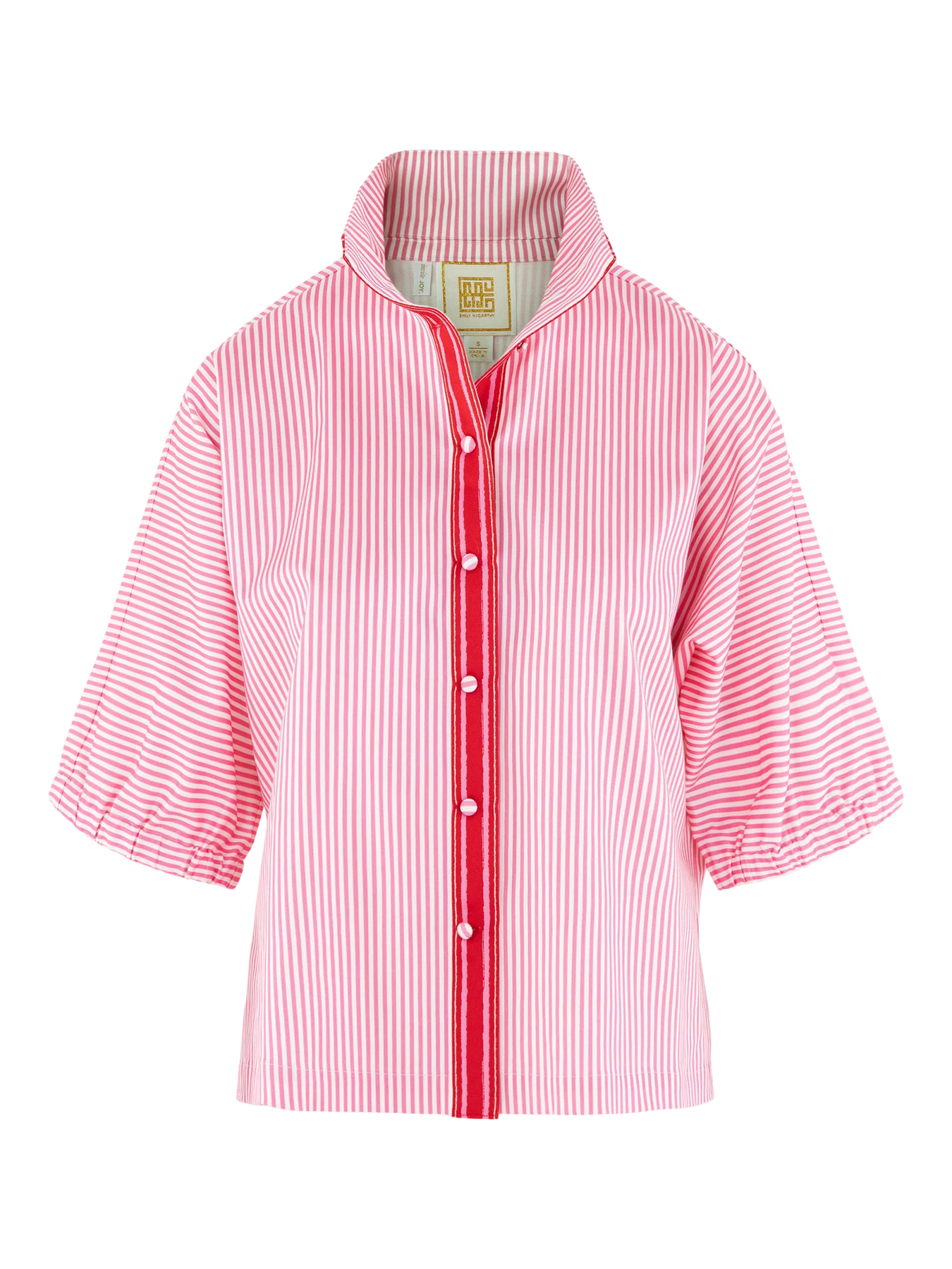 The Bonny Top in Pink Carnation Stripe offers a timeless silhouette with a playful, elevated twist. Designed with a loose, easy fit, this style features relaxed elastic dolman sleeves and a classic stand collar for a polished finish. A button-down front is accented with bold red trim, adding a pop of color that brings fresh energy to the classic stripe. Effortless yet thoughtfully detailed, this top is a versatile everyday staple with a joyful touch of color and charm.