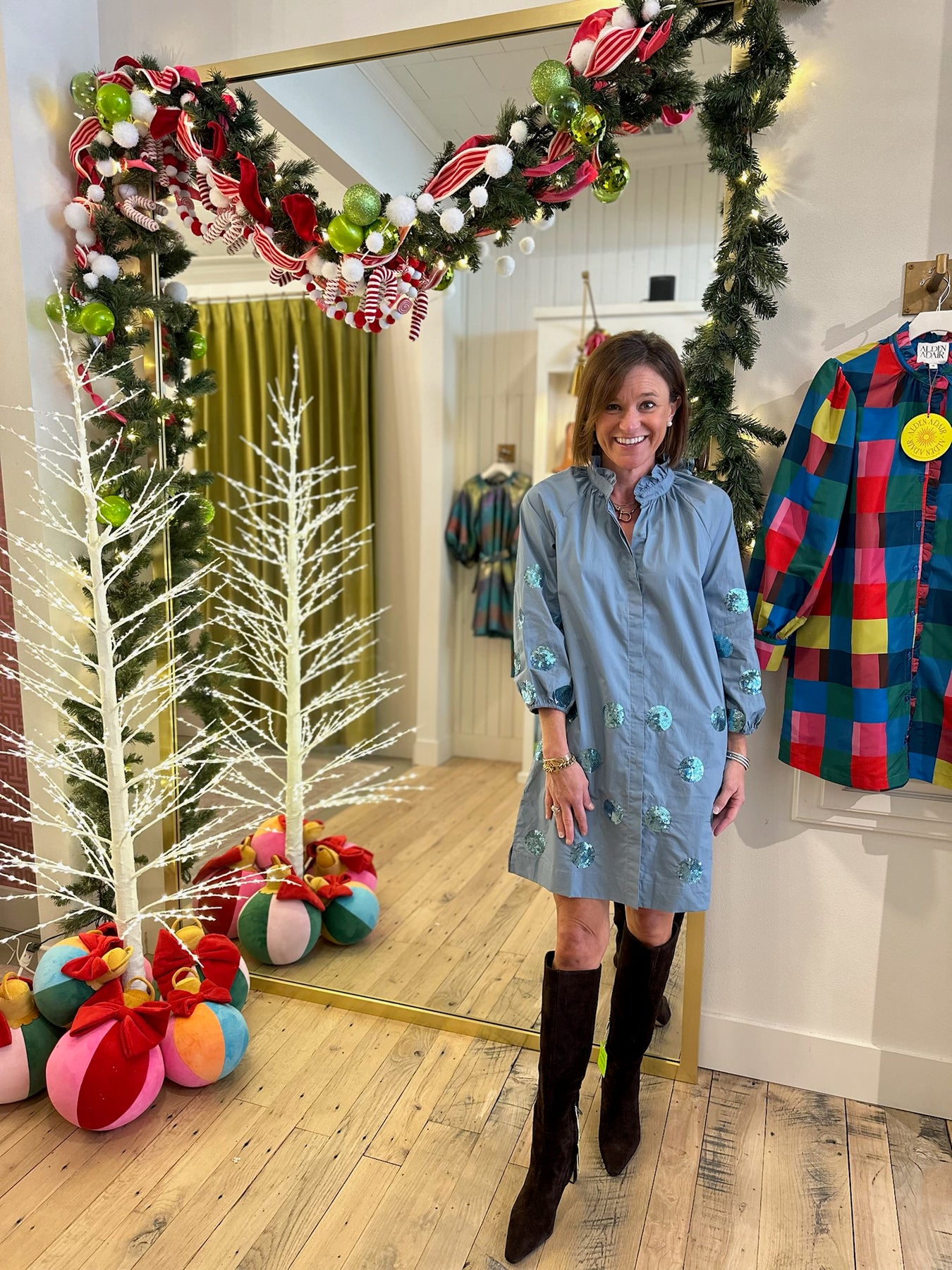 This stunning poplin & sequin frock is sure to be your next favorite piece. It's perfect for everyday casual with a sandal or sneaker– But you can certainly dress this up with a heel and some fabulous jewels.