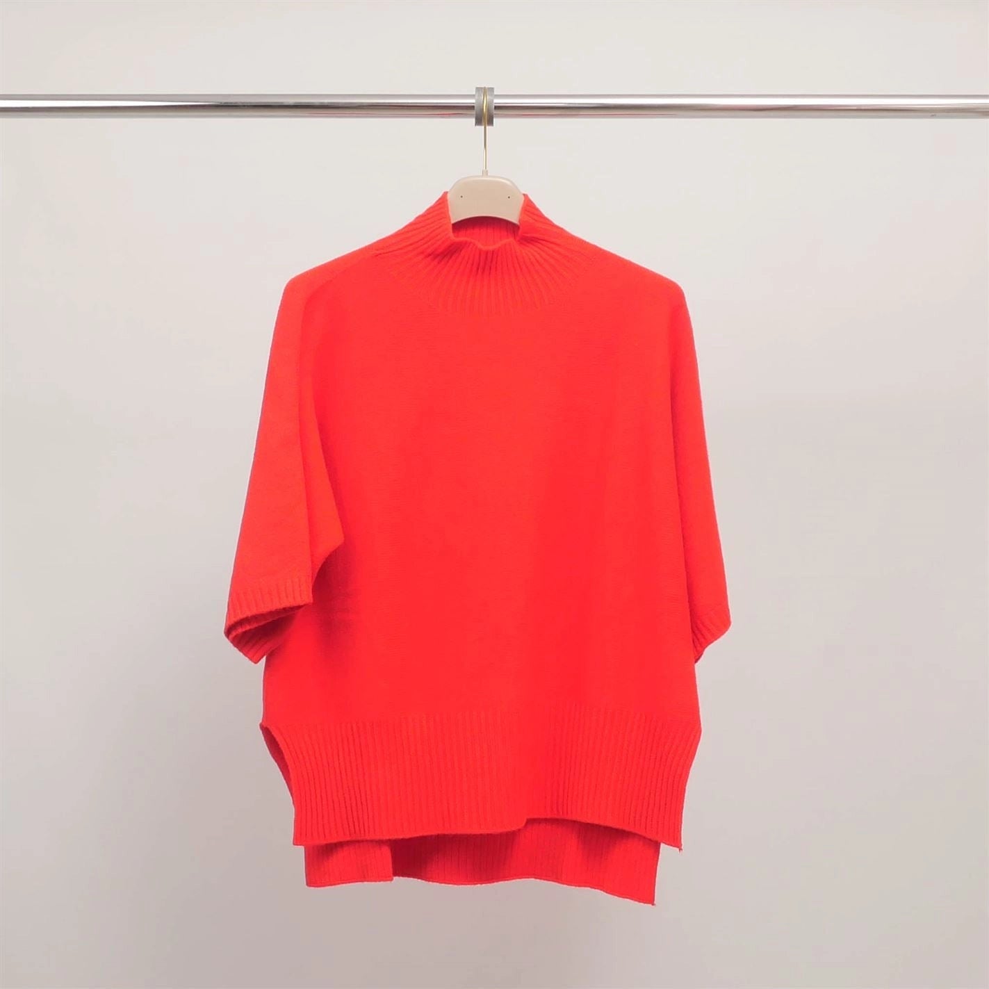 A modern and refined sweater, perfect for varying seasonal looks. Its slightly loose straight cut and ribbed high collar add an elegant and contemporary touch. The short sleeves and wide ribbed edges structure the silhouette while ensuring comfort and freedom of movement. Its soft and fluid knit makes it an easy piece to pair, to be worn with casual jeans as well as with a skirt or dress pants for a chic and versatile style.