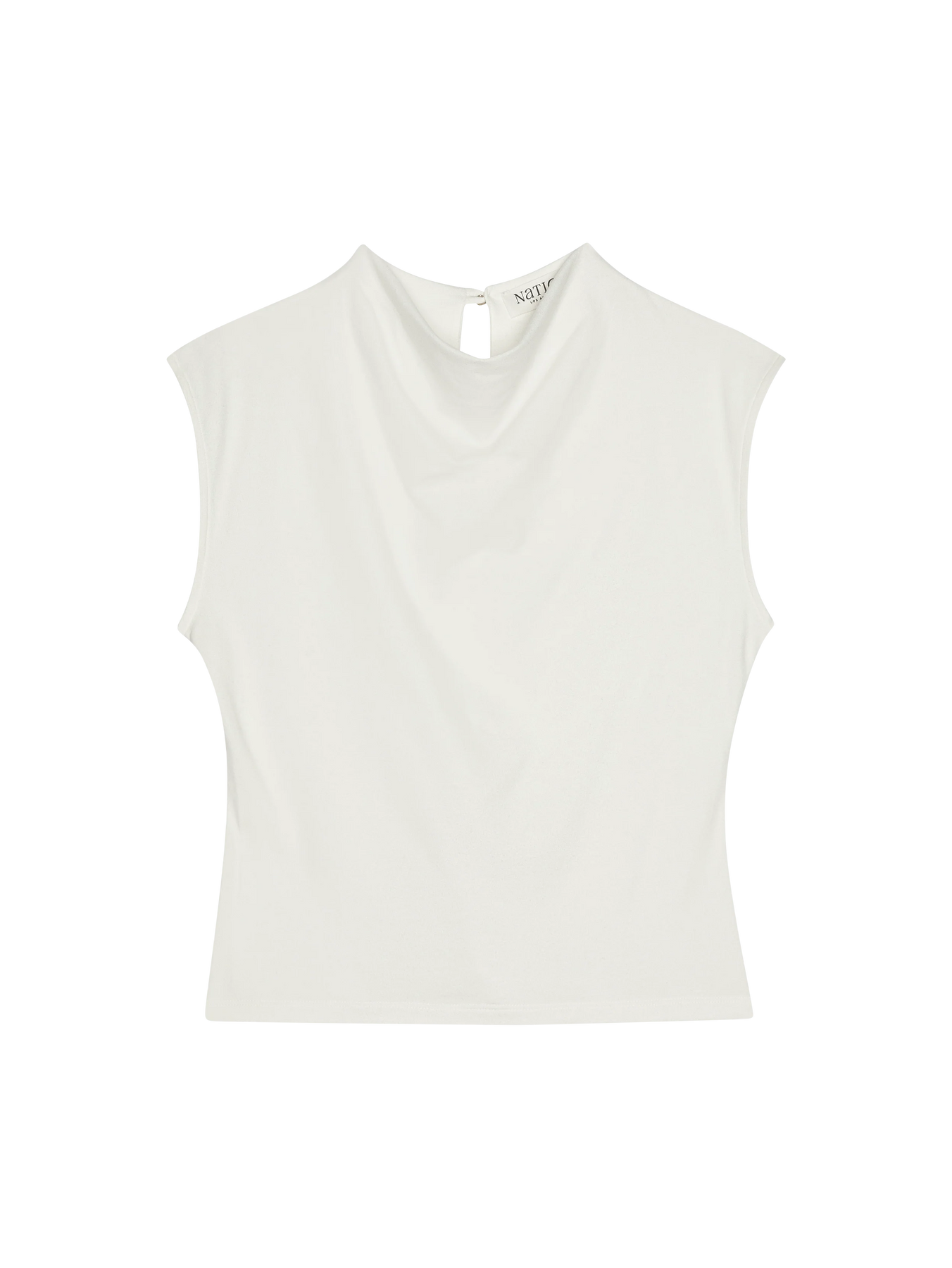 Minimal, structured, and elegantly feminine, this sleeveless mock neck tank has a clean silhouette, a subtle draping, and a button closure.