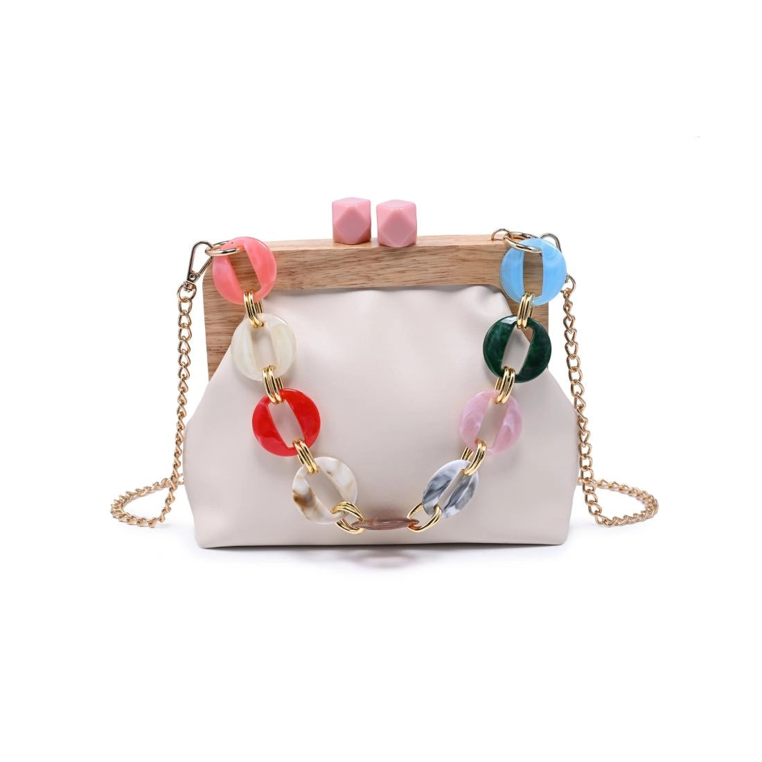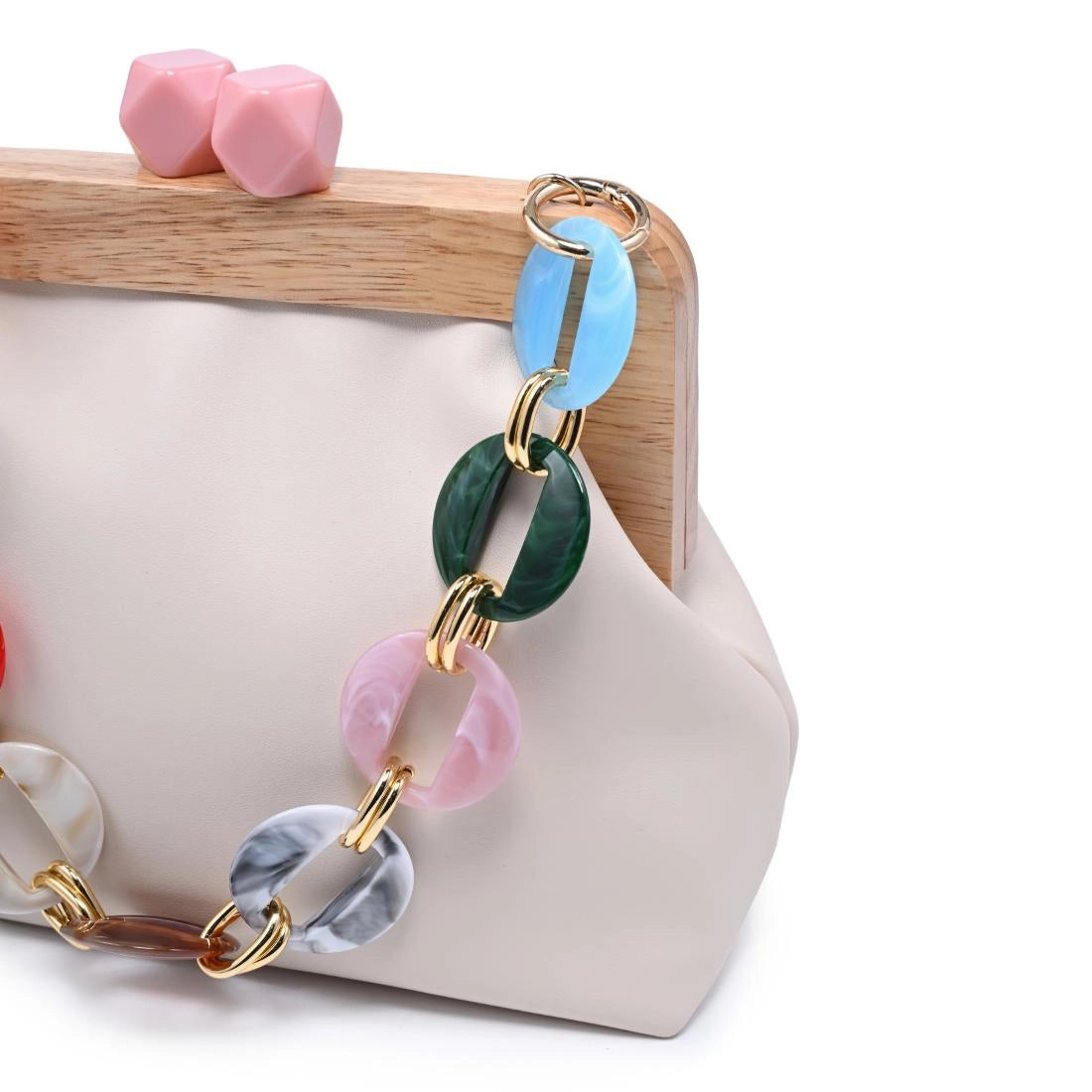 • Whimsical resin links meet a sleek wood-frame clasp.