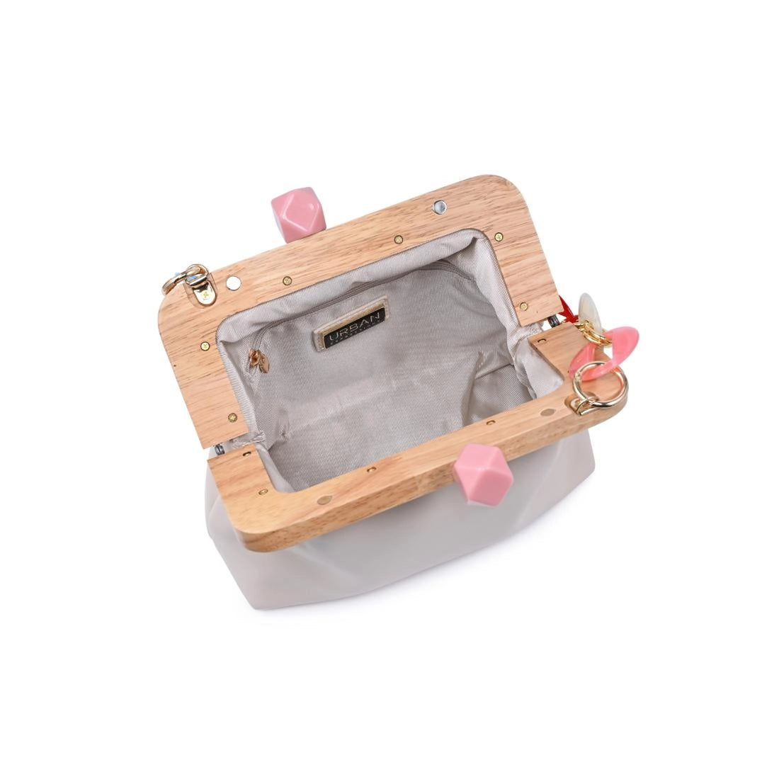 • Wooden frame kiss-lock with two pink geometric knobs provides a smooth open-and-close action.