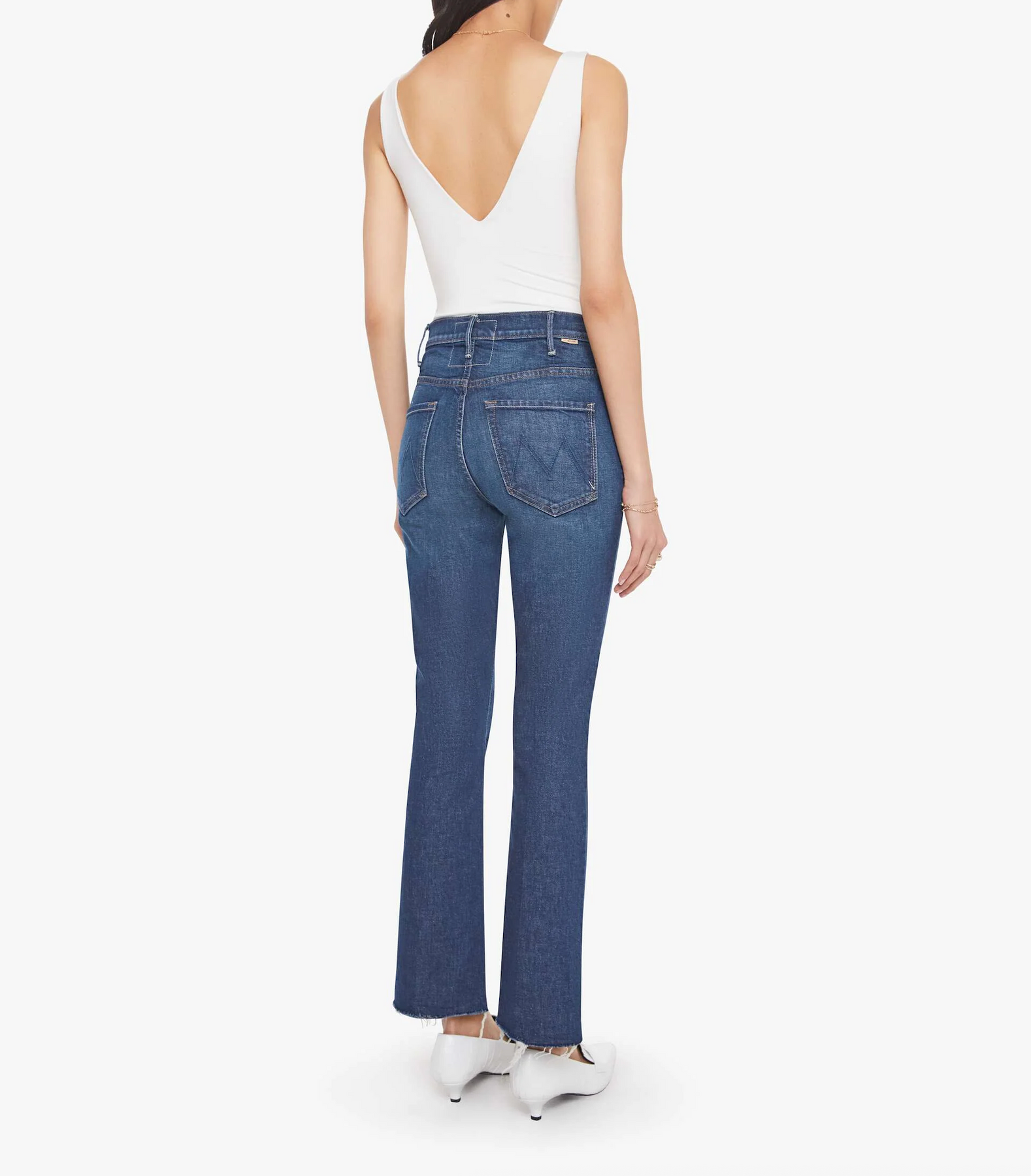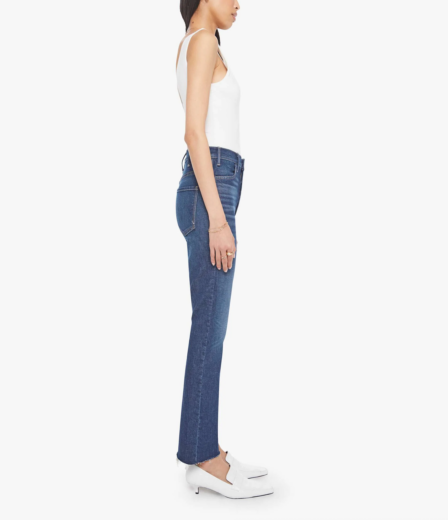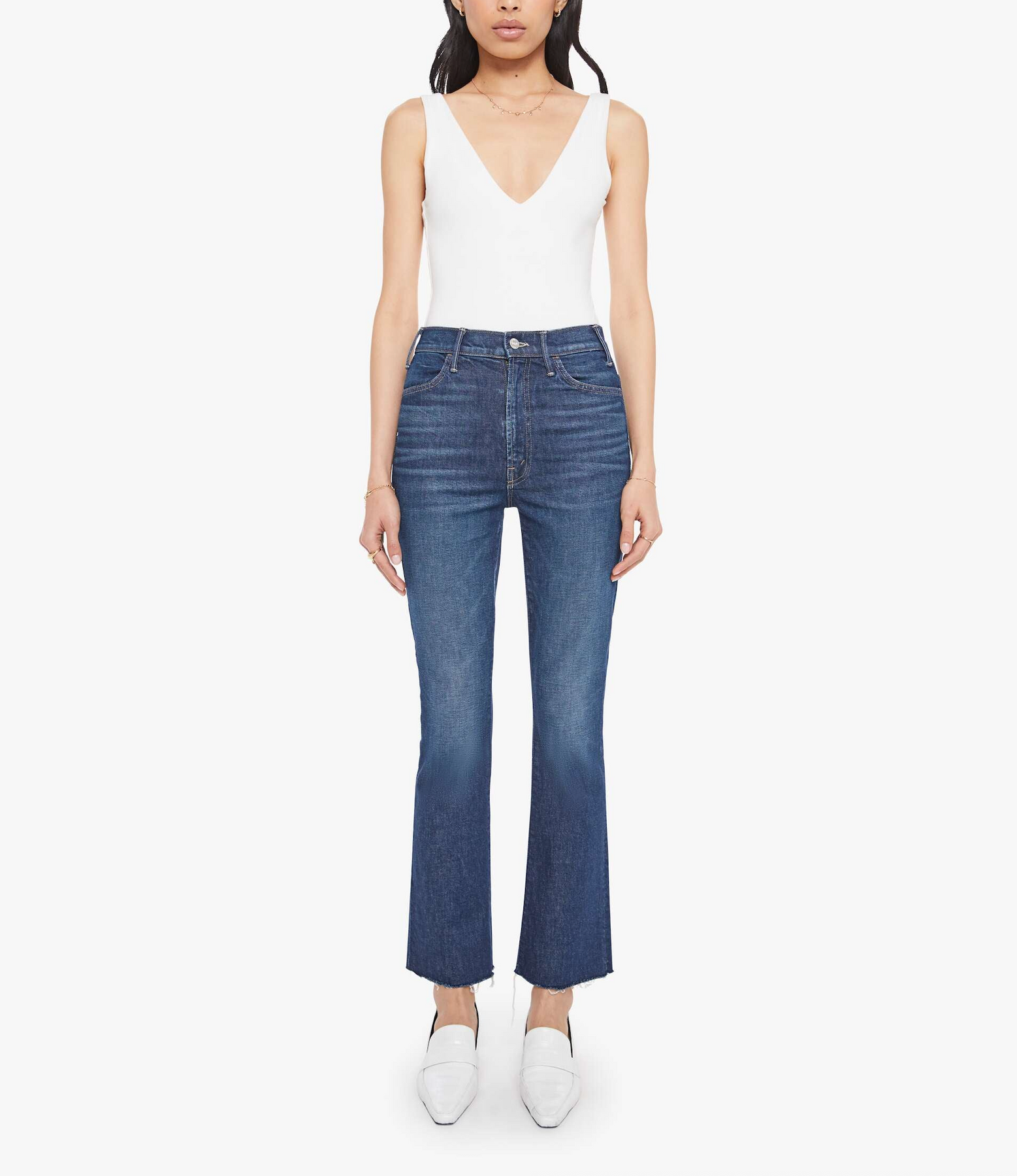Amped up. This high-rise flare has a zip fly, 28.25-inch inseam and a frayed hem. Made from semi-rigid SUPERIOR denim, Kicks And Riffs is a dark blue with subtle fading and whiskering.