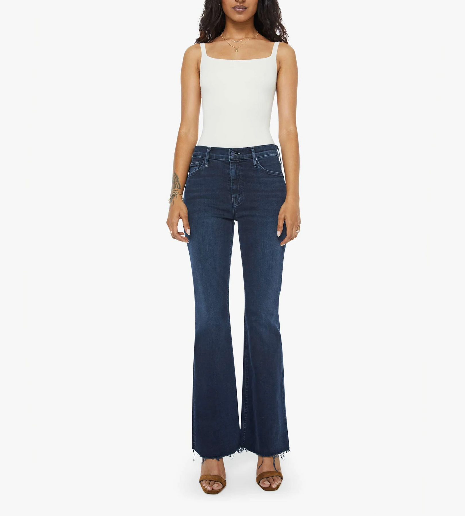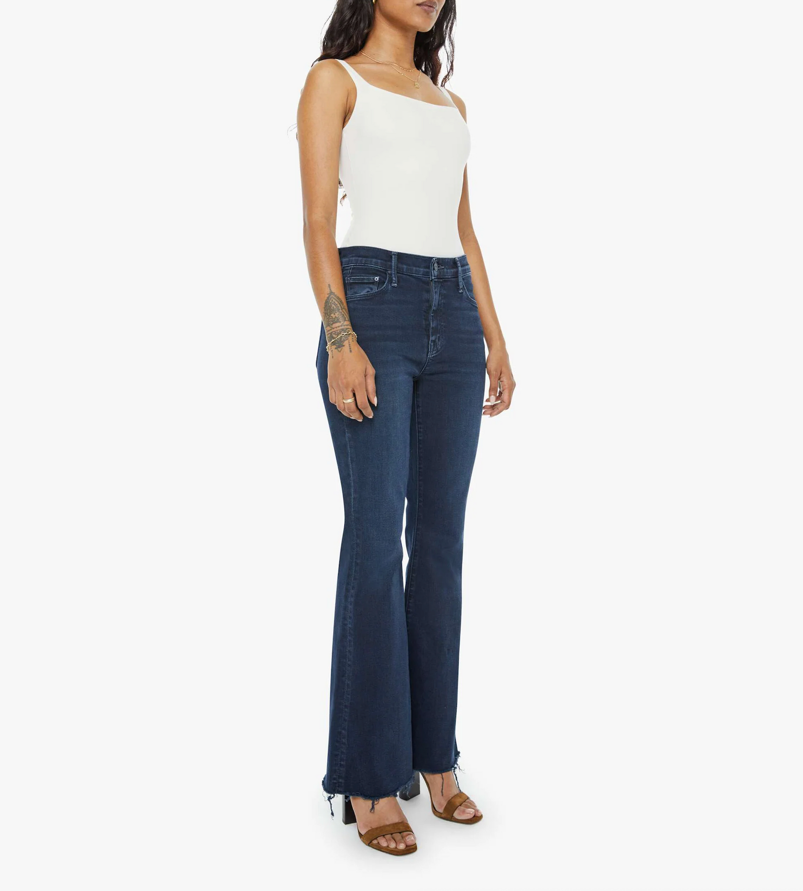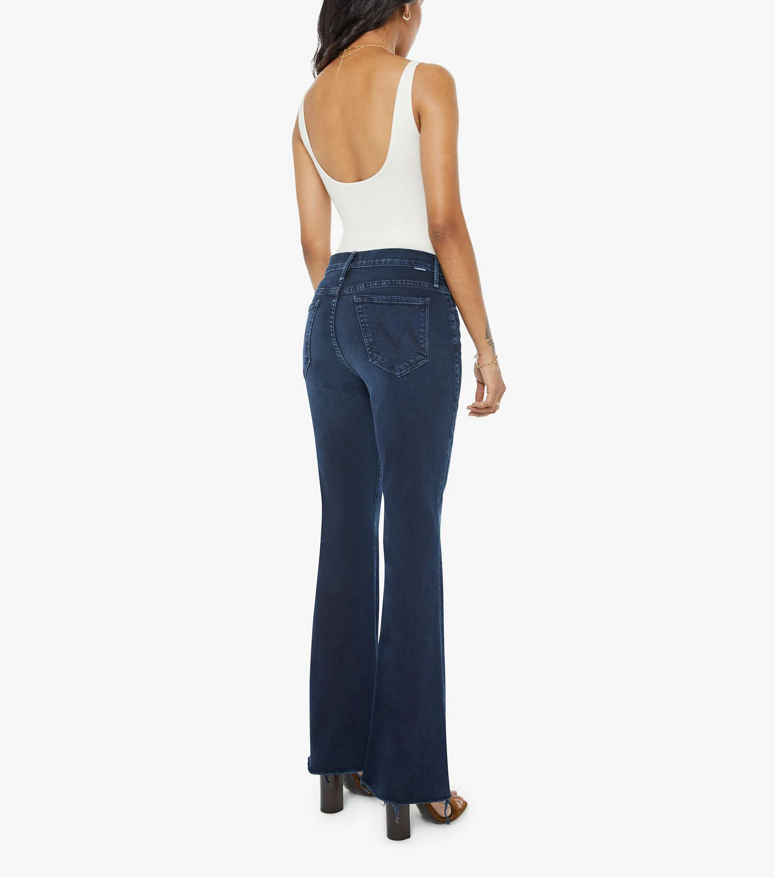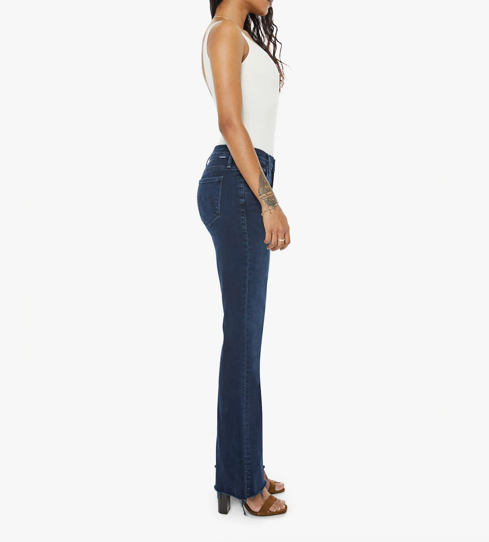 Our most popular mid-rise flare has a 29-inch inseam with a frayed hem. Cut from denim with a touch of stretch, Chip On My Shoulder is a dark blue wash with super subtle fading and whiskering.