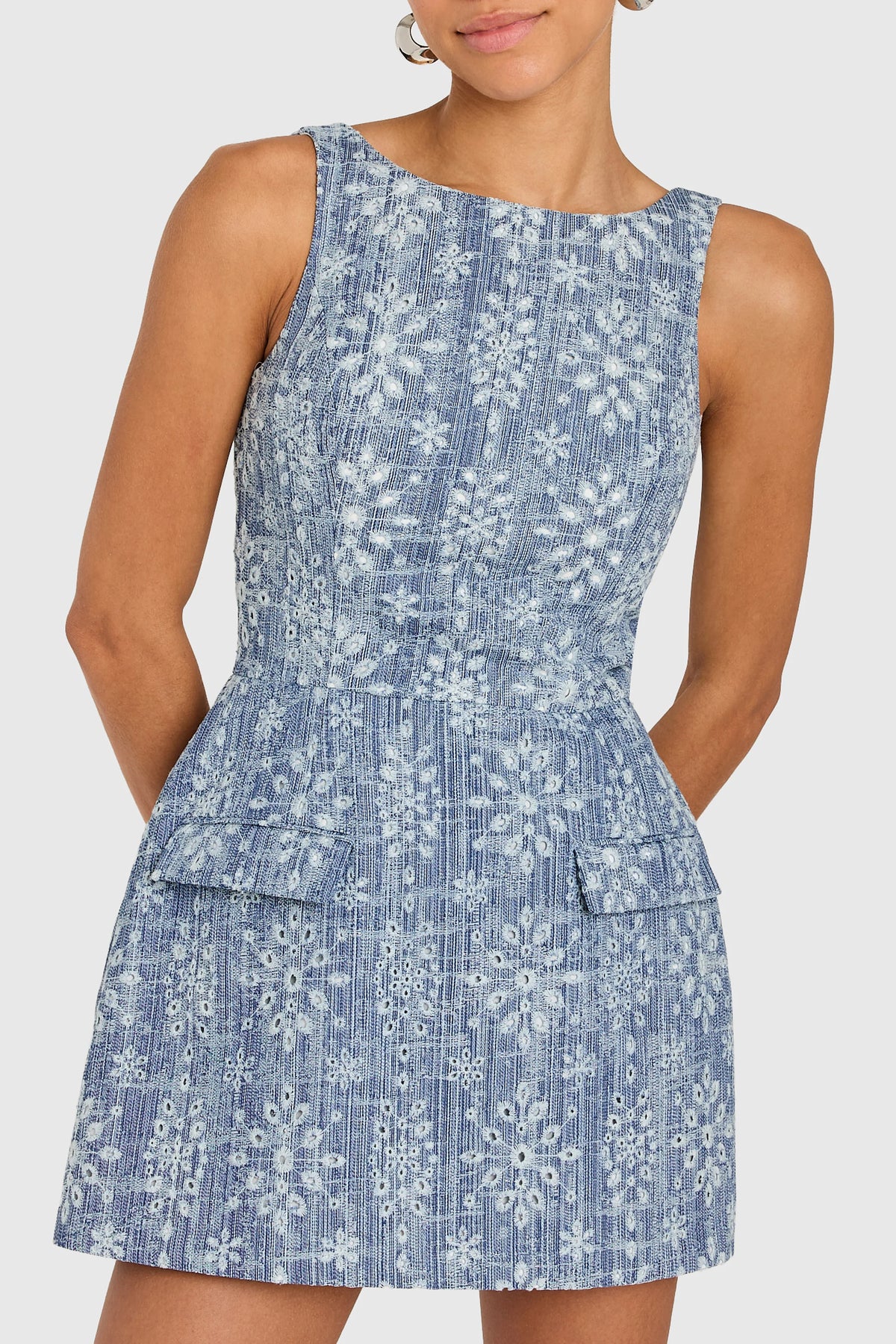 Stay sweet in the Clarissa Romper. Crafted from embroidered chambray, this boatneck mini features a sculpted skirt with charming pocket details.