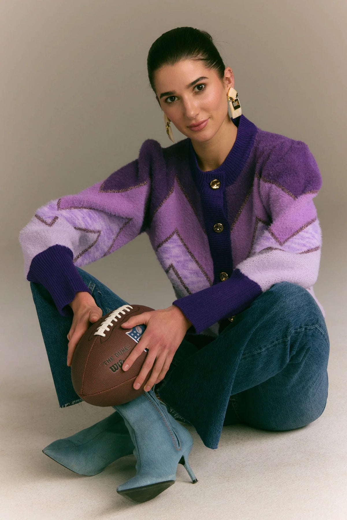 The Fuzzy Chevron Cardigan is a purple-hued cozy dream adorned with gold buttons. Slightly cropped in length and designed with a billowing sleeve leading into an elongated ribbed cuff. A hint of metallic throughout makes this sweater perfect to dress up.