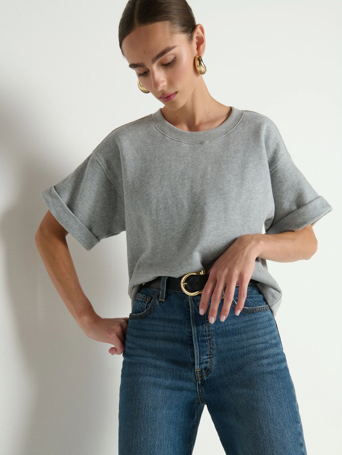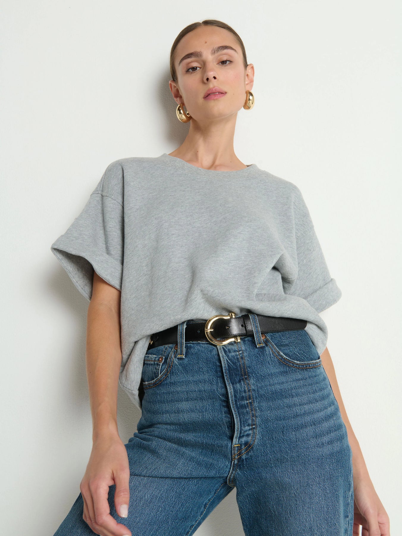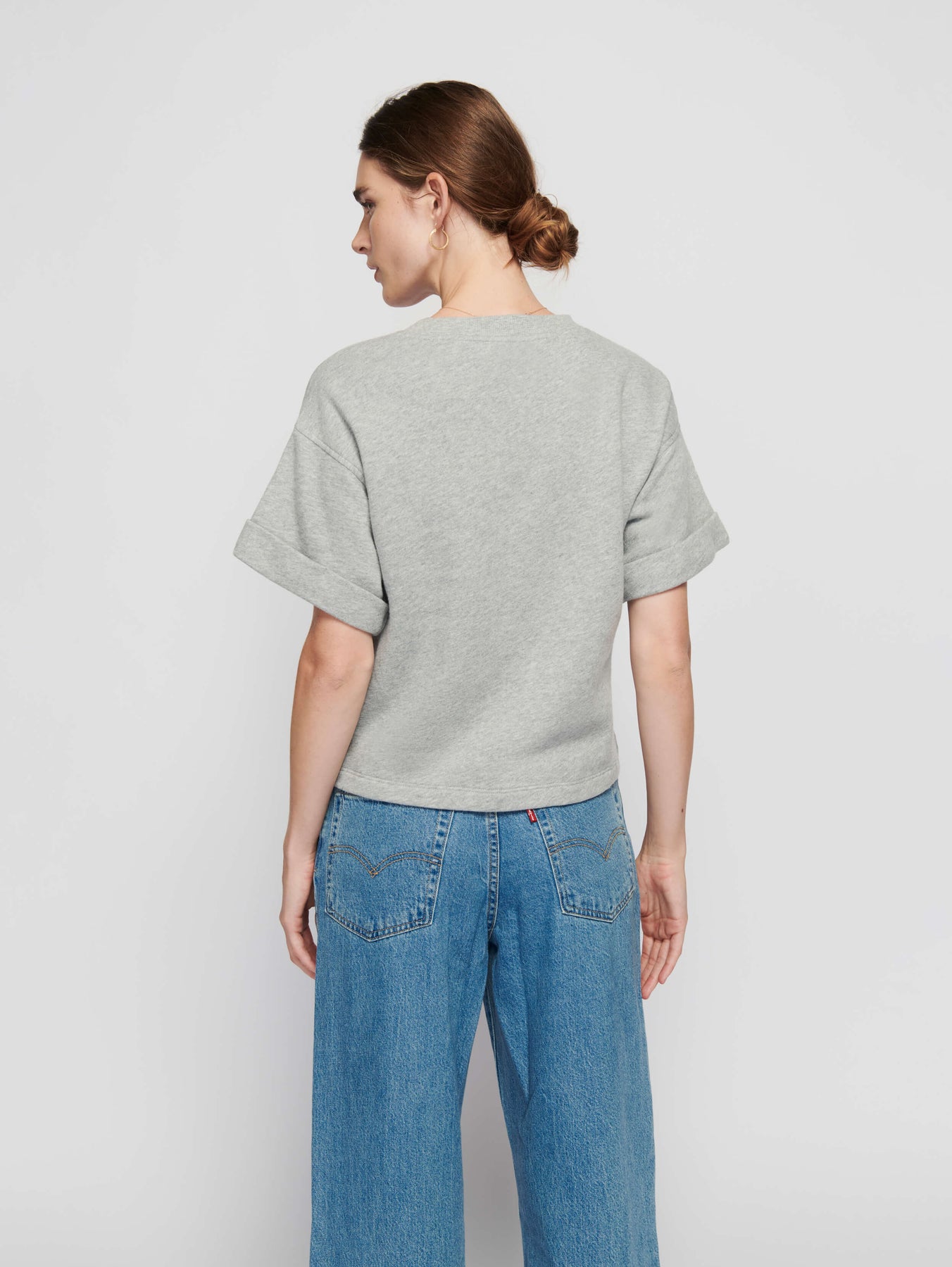 An oversized sweatshirt-tee with rolled boxy cuffs and an effortlessly relaxed fit. Perfect for those sunny spring days that’s kinda cool, but kinda warm…
