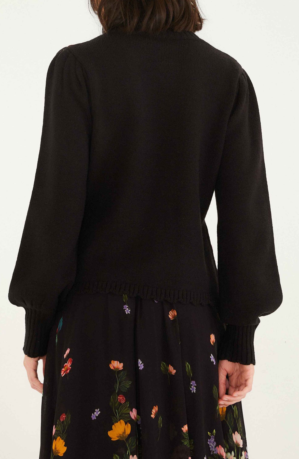 Chunky stitched flowers in hues of reds, pinks, and greens, as well as a scalloped neckline, hem, and arm holes elevate this sweater.